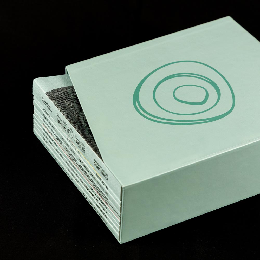 Para a capa escolhemos um fine paper cuidadosamente selecionado para realçar textura e singularidade. Introduzimos verniz espessurado reservado nas capas, uma novidade que exigiu iterações de teste até atingir relevo, brilho e definição de contorno exemplares. Na caixa de conjunto aplicámos verniz reservado para acentuar a elegância, garantindo contraste táctil e sofisticação sem ruído visual.